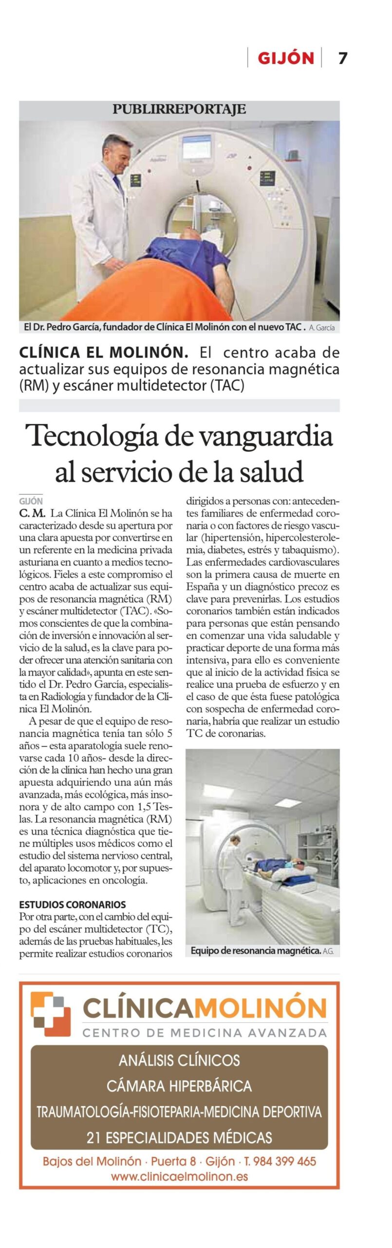 Cumpliendo con nuestro firme compromiso de ofreceros los medios diagnósticos más avanzados, esta semana El Comercio se hace eco de la renovación de nuestros equipos de Resonancia Magnética y de Escáner Multidector con estudios coronarios. Tu salud es lo primero para nosotros.